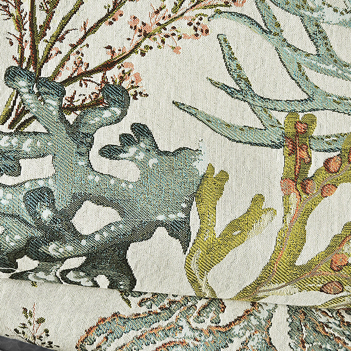 Coral Reef is a conversational jacquard fabric woven offering both durability and a soft hand. Its intricate marine-inspired design features coral and seaweed motifs in rich colorways. The detailed texture and vibrant palette make it ideal for statement upholstery or artistic textile projects./A