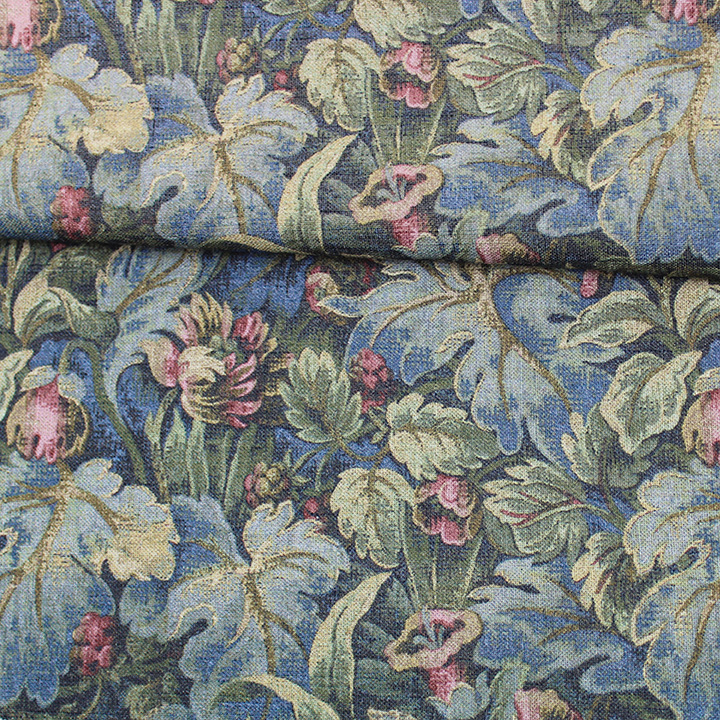 This printed fabric showcases a densely arranged pattern of large, intricately detailed leaves and flowers. The design creates a rich, textured surface that draws attention to its complexity. The fabric is soft and includes linen, contributing to its luxurious and natural feel.