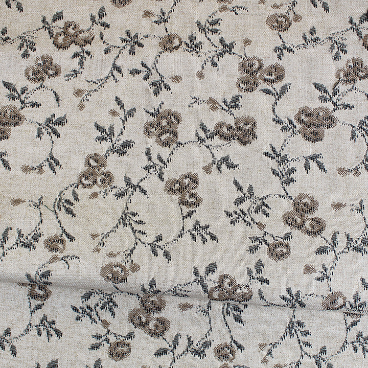 This woven fabric displays an intricate floral motif with delicate vines and blossoms that add elegance and detail. Its tight, uniform weave contributes to a polished look while supporting long-lasting use. The fabric has a soft hand, offering a smooth and comfortable tactile experience.